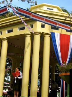 This morning, I woke up and Tammy, her mom, and I all ran into town, a ten minute walk we made in about 2, so we could see the torch being passed in the central square of Turrialba. They are celebrating their 190th anniversary of their independence from Spain. The torch travels around all of the major cities and is brought to every school by groups of students in their gym uniforms. The students meet at the town square light their torch and run it out to their school. At this festival we saw traditional dancing, heard the national anthem, heard other songs, and saw a local high school student, David, get an award for excellence in special olympics.